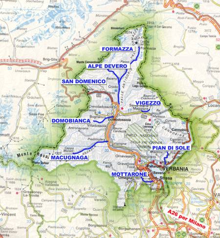 Anfahrt: Autobahn Richtung Simplonpas (Sempione) bis Ausfahrt Domodossola, in Domodossola auf die Schilder Domobianca achten (ca. 10 km).